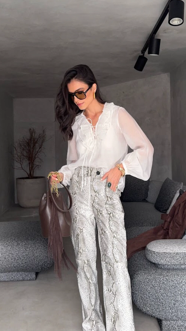 Descubra a elegância da Blusa Manga Longa Giulia, confeccionada com um sofisticado tecido que combina 74% lyocell e 26% poliéster. Os detalhes em babados no decote conferem um toque delicado e feminino, ideal para qualquer ocasião.