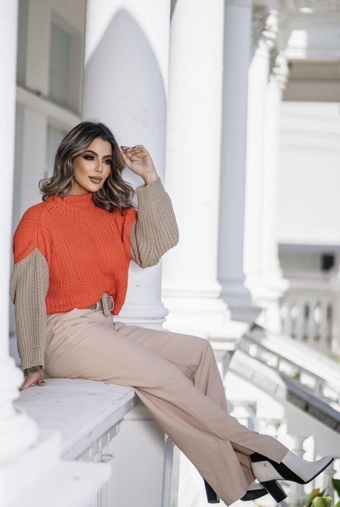 blusa em tricot duo color, possui corpol aranja e mangas bege, possui uma gola levemente alta, não aperta.